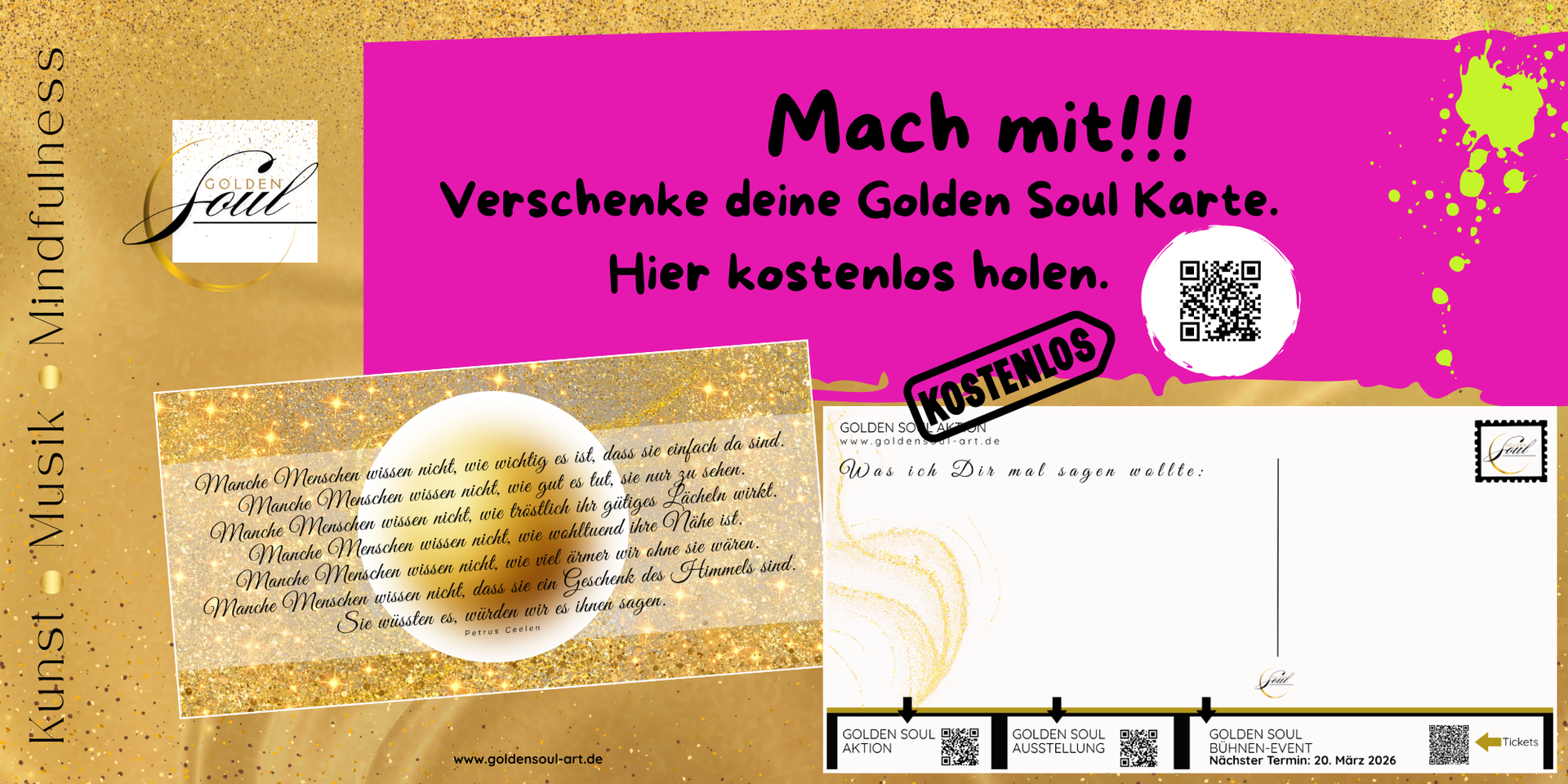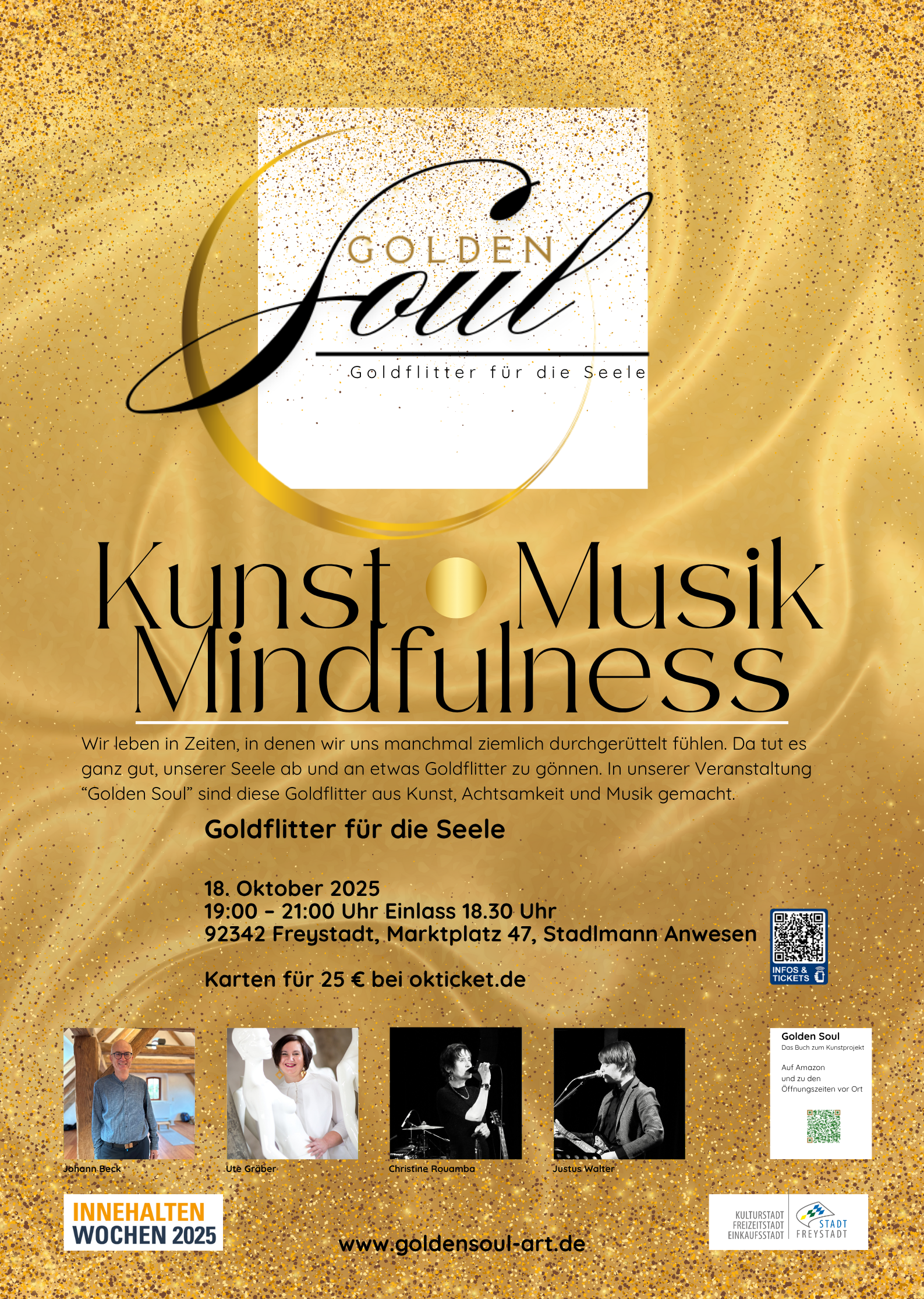 Da tut es ganz gut, unserer Seele ab und an etwas Goldflitter zu gönnen. In unserer Veranstaltung Golden Soul sind diese Goldflitter aus Kunst, Achtsamkeit und Musik gemacht.
