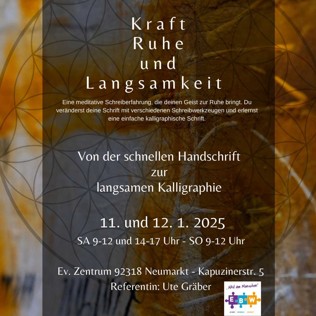 Tauche ein in eine kreative Reise der Selbstreflexion und der Stärkung deines Selbstwertgefühls in diesem besonderen Kurs, der sich mit menschlichen Gedanken und der Kraft der Handschrift und Kalligraphie beschäftigt. Gemeinsam lassen wir Glaubenssätze los, die uns verletzen und blockieren, und konzentrieren uns stattdessen auf unsere Stärken und positiven Affirmationen, die uns dazu ermutigen, unseren eigenen Wert und unsere Großartigkeit zu spüren.